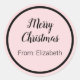 Este adesivo de Natal rosa pálido diz que Feliz Natal é um roteiro elegante. Texto adicional não-script está abaixo do script. Você pode editar o texto sem script para mostrar seu nome ou uma mensagem personalizada. A borda e o texto são pretos.