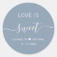 Um adesivo azul empoeirado para seus favores de recepção de casamento com "Love Is Sweet" em uma simples tipografia branca moderna e um elegante roteiro branco com supressões, seus primeiros nomes se juntaram por um coração e sua data de casamento.