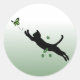 Um gato preto com olhos verdes pulando no ar tentando pegar uma linda borboleta verde.