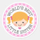 Vinhetas bonitas com uma pequena caricatura de cabelo loiro amarrado em porquinhos com arcos cor-de-rosa. Texto "A melhor irmã do mundo". Em volta está uma borda redonda, rosa, com bolinhas. Também disponível em uma versão para irmãs grandes.