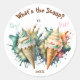 Um belo gênero moderno e moderno revela um adesivo de festa com uma ilustração em aquarela do sorvete em cones de waffle em cor rosa e azul com abertura de sorvete de ouro. O texto diz: "Qual é o furo? Menino ou Menina?" Perfeito para uma festa de gênero no verão.