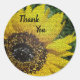 Este adesivo redondo, que chama a atenção apresenta um girassol mosaico com flores amarelas brilhantes complementadas por um centro de flores castanhas escuras e folhas verdes escuras. Uma foto de girassol recebeu uma barra de efeitos especiais para mostrar o padrão de mosaico visto neste adesivo. "Obrigado" está escrito em caracteres negros entre as pétalas e pode ser facilmente personalizado se você desejar.