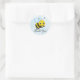 Adesivo redondo para favor do chá de fraldas com design de abelhas e fundo azul colorido com texto