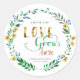 Coroa floral de aquarela desenhada à mão com margarida amarela e flores azuis minúsculas e folhas, com a mensagem "O amor cresce aqui" perfeita para adesivos de produtos, adesivos de lembranças de casamento, adesivos de chá de noiva, adesivos de anúncio de gravidez, adesivos de aniversário de bebê. A mensagem "Obrigado", nomes e data podem ser facilmente editados e personalizados.
