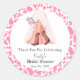 Agradecemos adesivos elegantes para Celebrar! Com uma noiva moderna em um vestido de noiva elegante, mostrando de forma divertida suas botas de cowboy enquanto segura um buquê de rosas e hortênsias, esses adesivos são a combinação perfeita de elegância e charme country. O fundo apresenta uma estampa de vaca rosa estilosa.