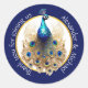 Um belo pavão real 5D (5 dimensões) com aparência real, com uma pena brilhante azul-escura no peito e uma pena suja de ouro e cauda azul. Sua coroa está lá em cima e ele está olhando para você. Este pássaro elegante é colocado contra um círculo branco redondo coberto por um fino dourado e uma borda azul escura na qual aparecem modelos brancas para a sua redação personalizada. O pássaro parece estar saindo do adesivo / rótulo e é ideal para presentes de casamento; chás de panela; aniversários de casamento e qualquer evento ou função que tenha um tema de pavão.