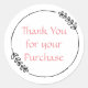 Um adesivo redondo com as palavras, "Obrigado pela sua compra." O quadro de folha redonda envolve o texto. O estilo e a cor da fonte do texto podem ser personalizados para seus detalhes.
