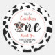 obrigado por comemorar conosco, Santa Vaca, virando um Primeiro Aniversário com um padrão digitalmente pintado de bonitinho e uma estampa de vaca com um nome e cores para personalizar, combinando cores rosa-coral, preto e branco. Desenhado e pintado por @rodicadraws.