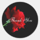 Um adesivo redondo mostrado com fundo preto e uma bela rosa vermelha. Texto: Obrigado Personalizar este item ou comprar como está.