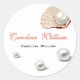 "Oceano 'A Little Pearl' sob o adesivo clássico redondo do chá de fraldas marinho, com tons suaves de creme e delicados sotaques de pérolas. Este elegante adesivo adiciona um toque refinado e encantador aos seus favoritos para festas, convites, ou decorações, complementando perfeitamente a sua celebração submarina."