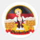 Oktoberfest Bar alemão Maid Classic Round Sticker. Oktoberfest Bar alemão Maid com várias cervejas em ambas as mãos.
