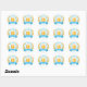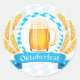 Oktoberfest Frothy Beer Mug Classic Round Sticker. Oktoberfest Frothy Beer Mug em uma bandeira azul marcada cercada por uma coroa de trigo.