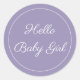 Um simples e fofo adesivo de presente de "olá menina" para um novo presente de bebê. Texto na fonte do script. Script branco sobre violeta pastel.