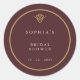 Elegant Old Money burgundy round bridal shower sticker with faux gold accents, customizable in the Zazzle editor.
