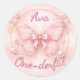 Celebrate a One-derful first birthday with this elegant pink butterfly round sticker featuring a satin bow and gold circle detail. Perfect for butterfly birthday party favors, treat bags, and pastel-themed celebrations. A sweet and stylish choice for a baby girl’s first birthday.