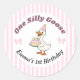 Add a sweet finishing touch to a first birthday celebration with this adorable One Silly Goose pink 1st birthday sticker. Featuring a cute cartoon goose wearing a party hat and holding a birthday cake, this sticker is perfect for a girl’s first birthday with a soft pastel and vintage-inspired style.