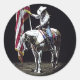 Uma bela fotografia da vaquinha num palomino e cavalo de pintura branco segurando a bandeira americana durante o Hino Nacional no Stampede do Rio Cobra de 2014.