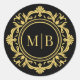 O ornamentado Floral Monograma com o Elegante Black Dourado Clássico Round Sticker apresenta as iniciais personalizadas dos monogramas na tipografia elegante rodeada por uma estrutura floral ornamental e por uma camada de texto personalizada sobre fundo preto. Adicione como um selo de envelope aos seus convites de casamento, salve as datas, favores de casamento, presentes e muito mais. Os autocolantes do monograma perfeito para casamentos, noivados, aniversários, aniversários, aniversários, festas de cocktail, festas, Natal, celebrações, criações corporativas e empresariais. Criado pelo Evco Studio www.zazzle.com/store/evcostudio