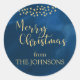 Um adesivo azul-redondo da meia-noite é embelezado com estrelas ouros e tipografia de fontes de script dizendo "Feliz Natal" na mesma sombra de ouro. Personalize com seu nome no modelo fácil de usar. O adesivo de 1,5 polegadas foi projetado como um selo, mas você também poderia mudar o estilo para um adesivo de 3 polegadas para usar como etiquetas de presentes em seus presentes empacotados. Parte da coleção "Luz Ouro de Natal". #feriadoZ