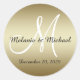Um selo de envelope de casamento monograma personalizado em ouro shimmery adiciona esse toque extra de elegância ao seu convite de festas de aniversário de casamento. Ouro Monogramas Stickers. Design por Elke Clarke ©. Ouro metálico impresso (efeito fotográfico em forma artificial). Os autocolantes monográficos personalizados são perfeitos para o seu selo de envelope nos envelopes do 50º aniversário de casamento. Os adesivos do monograma na moda também irão parecer excelente nos seus favores de casamento ou bolsas de doces de casamento ou caixas de bolo de casamento. Personalize com seus nomes de noiva e noivo, monograma inicial e data de casamento. Em seguida, escolha entre uma variedade de formas e tamanhos.