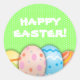 Um adesivo de Páscoa com um agrupamento de ovos de cor clara no fundo contra um fundo de bolinhas verde e branco.