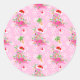 Flores de Natal cor-de-rosa vestindo as luzes de cordas e um chapéu de Papai Noel em fundo rosa com flocos de neve e palmeiras festivamente decoradas. Mostrado aqui num adesivo redondo personalizável. Você pode redimensionar facilmente o padrão para sua preferência e selecionar sua cor de fundo favorita. Use-o para decorar pacotes de presentes, cartões de saudação, livros de recortes, bolsas de tratamento e muito mais. É um padrão bonito para celebrar o Natal com uma vibração tropical!