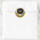 Sirva alguns presentes em um saco de favor ou sele o correio com este adesivo elegante. Este padrão listrado em zigue-zague preto e branco destaca a parte superior deste adesivo que apresenta um círculo de caligrafia em brilho dourado com texto sobre um fundo dourado brilhante. Preencha os campos do modelo ou clique em personalizar para selecionar um estilo de fonte, tamanho e cor que você gosta.