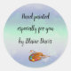 Este adesivo editável apresenta uma paleta de pintor com pincéis contra um fundo de cor d'água gradiente. O texto diz: "Mão pintada especialmente para você por (nome). O texto é editável para que você possa alterar as palavras, bem como o estilo, o tamanho e a cor da fonte e torná-la sua! Desfrute da sua nova Paleta de pintores editáveis, especialmente para seu adesivo redondo clássico!