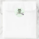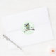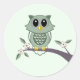 O adesivo redondo personalizado tem uma coruja verde vetorial fofa num galho com folhas e flores e um fundo verde claro e personalizável.