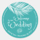 Este adesivo de Boas-vindas de Palma Tropical de Turquesa é excelente para o casamento de destino ou praia. Pode ser usado para cartazes de casamento ou para favores de casamento. Opções de cores diferentes disponíveis.