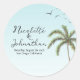Estas etiquetas de autocolante personalizadas apresentam um tema tropical para um destino ou um simples casamento na praia. Imagem à direita de uma palmeira, com um bando de pássaros voando acima. O fundo é um gradiente azul-céu. Os nomes do casal são impressos à esquerda em uma letra elegante, seguida da data e do local do casamento.