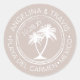 Um design de carimbo de passaporte personalizado para temas tropicais num STICKER com uma palmeira simples com nomes e datas em volta de um círculo, num fundo de cor branca e alta personalizada que é excelente de selar envelopes ou de favorecer pacotes num casamento de destino de praia. A cor de todos os elementos do design pode ser alterada para combinar com o tema do seu casamento, fazer esta etiqueta divertida com um logotipo de casamento que criará uma vibração divertida e bestial.