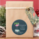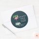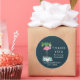 Etiquetas de festa com uma ilustração de um flamingo cor-de-rosa com palmeiras verdes atrás e um buquê decorativo floral suculento abaixo. Tropical e bonito. O fundo é azul escuro.