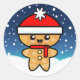 Gengibre de Natal bonito, kawaii, vestindo um chapéu vermelho e branco e um cachecol vermelho. Ele tem dois botões amarelos, glacé branco e rosto feliz. Ele está parado na neve numa noite fria de inverno com flocos brancos de neve caindo ao seu redor.