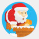Esta imagem é um vinheta alegre de férias mostrando Papai Noel em seu clássico terno vermelho e chapéu, saindo alegremente de uma chaminé de tijolos com neve no topo. Seu grande saco de presentes é visível atrás dele, e uma lufada de fumaça sobe da chaminé, capturando o momento mágico da véspera de Natal. Um design festivo e lúdico perfeito para decorações de férias, cartas ou uso digital.