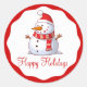 Um boneco de neve balbuciano está vestindo seu chapéu de Papai Noel, e um cachecol vermelho e listrado de ouro. Ele tem um nariz de cenoura, um sorriso grande e mãos penteadas. Feliz feriado é o texto de uma letra vermelha festiva, abaixo, sobre fundo branco. Uma borda em círculo em vermelho de Natal correspondente fornece a borda deste adesivo em rótulo redondo. Simples, clássico e divertido para a estação.