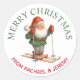 Um belo adesivo de Natal para presentes, pacotes, cartões de Natal, favoritos para festas e muito mais, este design apresenta um texto circular em torno de uma ilustração colorida de um elfo sobre esquis. Edite os nomes mostrados com seus próprios nomes ou outro texto.