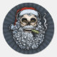 Crânio de Papai Noel com barba branca comprida, chapéu de Papai Noel, óculos redondos e chamando um charuto fumante. Desenho colorido, caneta e tinta em t-shirts, camisas de suor, cartões e artigos de presente.