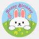Feliz Aniversário com adesivos de coelho. Um coelho branco de desenho animado com orelhas grandes rosa e um rosto fofo está saindo do seu buraco. Ele está cercado por grama verde e flores bonito sob um céu azul claro. Sobre o coelho estão as palavras Feliz Aniversário em letras cor-de-rosa.