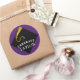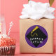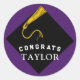 Adesivos de presente de formatura roxos e etiquetas de favor de festa com design de gorro de formatura preto com borla dourada. Edite o texto para adicionar o nome do graduado.