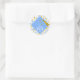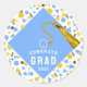 Etiquetas de festa de formatura criativas, selos de envelope e adesivos de presente, com boné azul claro e borla dourada em fundo de confetes. Edite o texto para adicionar o nome do formando e o ano da turma.