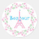 Possui flores rosa bonito e o ditado "Bonjour" (Olá) em francês. O texto pode ser personalizado. Excelente para selar envelopes ou a favor do bolsas! Convites, placas de papel e guardanapos estão disponíveis na minha loja. Design ©2019 Rosalind Moore, Design de Cherry Lane.