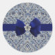 Adesivo redondo com uma imagem de indigo e paisley francês branco e uma flor de prata delicada numa fita e arco de marinho bonito. Veja confetti e papel de empacotamento. Veja toda a coleção Este & Aquele adesivo na seção CARDS, POSTCARDS & STICKERS.
