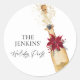 Saúde à estação! Apresentando uma design de garrafa de poinsettia e champanhe, esses adesivos clássicos redondos do Partido Cocktail de Férias são perfeitos para selar convites, vestir favoritos para festas ou adicionar um toque festivo a bolsas de goela. Use-os como etiquetas de vidro de cocktail ou etiquetas decorativas para a sua reunião de férias! Projetado pelo Design do Partido Cava