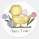 Trabalho de arte primitivo do país bonito de um pintinho amarelo fofo, com um arco rosa bonito. O pintinho do bebê está rodeado de flores coloridas e de um ovo de Páscoa pintado. O texto abaixo lê Felz pascoa e pode ser personalizado para ler o que você quiser. Excelente de Páscoa adorável para as crianças ou como selos de envelopes para os cartões de saudação de Páscoa.