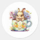 Este adesivo redondo é mostrado em branco com um coelhinho de Páscoa giro em um impressão de água de chá. Personalize este item ou comprar como está. Imagem do stock