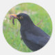 Um pássaro-negro levado na primavera enquanto coleciona vermes para os jovens no seu ninho.