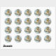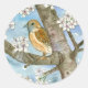 Bonito adesivos decorados com uma pintura aquosa de um pequeno pardal numa fruta florescente em primavera com um fundo turvo e tempestuoso do céu.