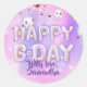 A moderna tendência personalizou design de adesivos de aniversário com balões, confete e luzes brilhantes em um fundo holográfico pastel.