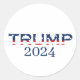 Este adesivo patriótico da campanha presidencial Donald Trump 2024 apresenta o nome "Trump" impresso em um padrão de bandeira americano. As estrelas são impressas na metade superior e as listras na parte inferior. O ano de eleição "2024" é impresso abaixo em uma fonte azul marinho.